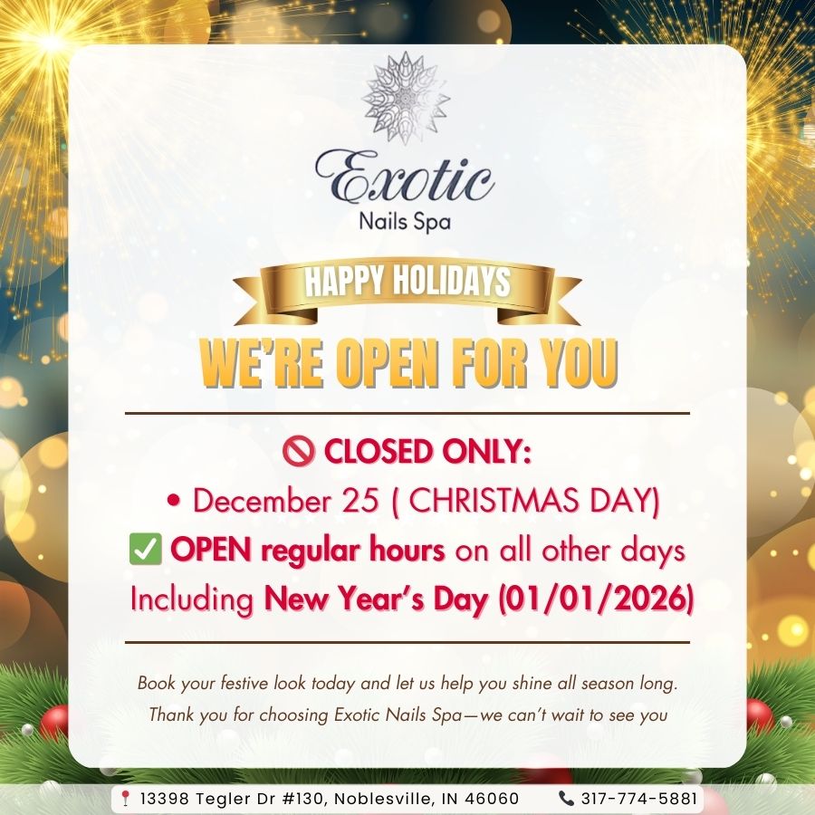Have a relaxing time and be more beautiful after enjoying high-end services at one of the best nail salons in Noblesville: Exotic Nails Spa! Located conveniently in Noblesville, IN 46060, our nail salon is proud to deliver the highest quality for each of our services.